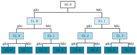 The wavelet packet transform (WPT) is a widely recognized wavelet transform technique known for its properties of orthogonality, completeness, and time–frequency localization. Compared to the traditional discrete wavelet transform (DWT), WPT allows for further decomposition of signals in the high-frequency region, providing detailed information in addition to the approximation signal [21]. WPT is practically implemented using a series of recursive low-pass and high-pass wavelet filters (as depicted in Figure 6). In essence, the signal undergoes iterative decomposition with the low-pass filter and the high-pass filter .