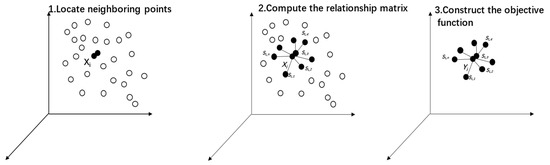 The process of the LPP algorithm can be mainly divided into three steps [23,27,28,29,30]: (1) finding nearest neighbors; (2) computing the affinity matrix; and (3) constructing the objective function, as shown in Figure 8.