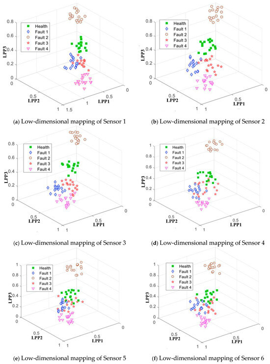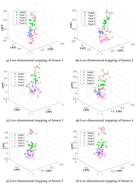 We use LPP manifold learning to perform dimensionality reduction on , where the reduced dimensionality . Each sensor ultimately obtains an low-dimensional mapping sample, and the analysis results of the training and test samples are shown in Figure 9 and Figure 10.