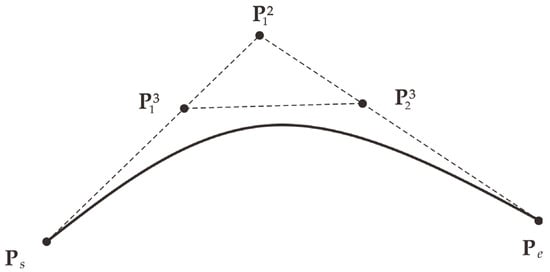 By substituting Equation (8) with the coefficients from Table 1, the quadratic Bézier curve with control points Ps, , and Pe would be equivalent to , as follows: