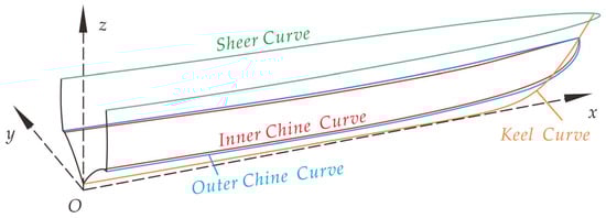 The typical body contour curves of a monohull unstepped planing hull with spray rails are depicted in Figure 2. The hull coordinate system O-xyz is utilized, where the x-axis extends from the stern to the bow, the y-axis is horizontal and points towards the left side of the craft, and the z-axis is vertical, pointing upwards. The origin is located on the vertical line, which is determined by intersecting the plane of the stern and the longitudinal section of the craft, and it is at the same height as the forefoot point at the keel. From bottom to top, the presented curves are the keel curve, inner and outer chine curves, and sheer curves.