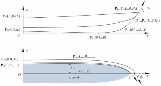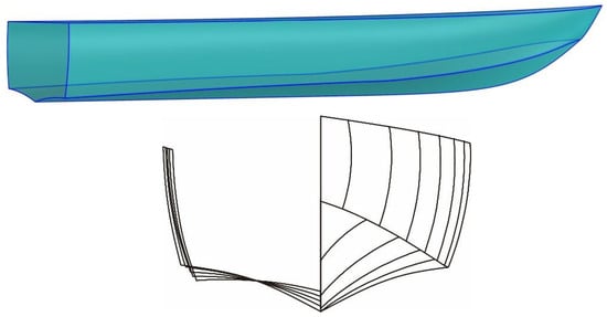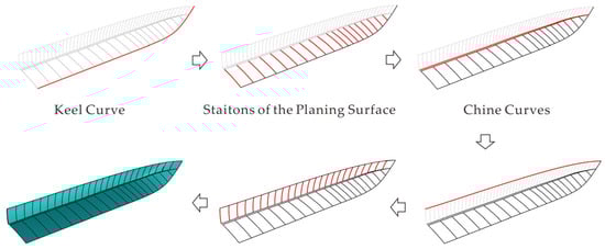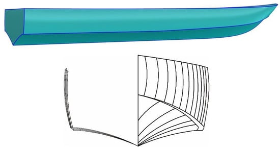 In general, there are two main categories of parametric design approaches for hull design. One approach involves modifying existing hull surfaces by designing transformation parameters, such as the free-form deformation (FFD) method, the so-called Lackenby transformation method, and the morphing approach [2,3]. These methodologies depend on the selection of an initial hull shape, which leads to a limited design space, and many transformation parameters have no physical meaning. Another approach is full-parametric modeling, which constructs point–curve–surface entities based on given design parameter constraints without relying on the initial hull shape. This design approach achieves a complete definition of the entire hull geometry solely through the design parameters.