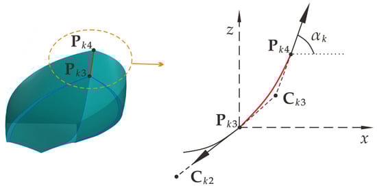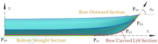 The outward section of the bow is located at the end of the keel curve, which starts from point Pk3 and ends at Pk4 (see Figure 7). At point Pk3, it satisfies first-order continuity with curve Sk2(u). The tangent vector of endpoint Pk4 makes an angle αk with the x-axis, which is appropriately expressed via a quadratic Bézier curve, as given by Equation (13). Further, denotes the control point that should be suitably determined.