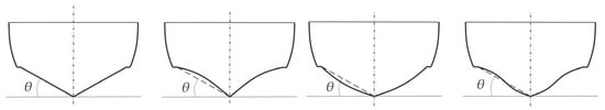 The planing surface plays a pivotal role in the hydrodynamic performance of the watercraft during the planing process. Depending on the vessel type and performance requirements, there are various design forms for the planing surface station curves (see Figure 8). The angle between the chord line connecting the two endpoints of the planing surface station curve and the horizontal plane is defined as the deadrise angle θ. Moreover, it is possible to incorporate multiple cross-sectional types and deadrise angles at different longitudinal positions for the same planing hull model. In this way, a series of longitudinal coefficients can be utilized to define the main characteristics of the planing surface.