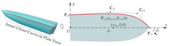 The inner chine curve in plan view is illustrated in Figure 9, extending from Pc0 at the stem to Pc1 at the transom through the widest point Pcm. A cubic Bézier curve is utilized to represent the chine curve, where Cc2 and Cc3 represent the control points to be determined.