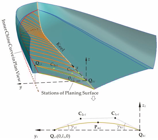 For the analysis of the i-th station, by substituting xi into the segmented keel curve in Equation (20), the intersection point Qki of the keel curve and the cross-section can be determined. By substituting xi into the horizontal projection of the inner chine curve in Equation (15), the corresponding abscissa yQci of Qci is evaluated. Hence, the chord length can be evaluated by the following: li = yQci/cos(θi). For ease of analysis, a local coordinate system Qki-xiyizi is established, with Qki as the origin. In this local coordinate system, the x-axis aligns with the hull coordinate system, and the y-axis aligns with the chord line. Let the rotation matrix around the x-axis be denoted as Rθi. The relationship between the coordinates of an arbitrary point P in the hull coordinate system and its coordinates in the local coordinate system Qki-xiyizi is as follows:
