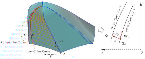 Fitting the discrete points Qci that were calculated in Section 3.2.2 can establish the inner chine curve. There are two main methods for fitting 3D curves with discrete points: approximation and interpolation. The approximation method constructs curves with fewer nodes, establishes an overdetermined system of equations, and utilizes algorithms such as least squares to evaluate the curve control points. In the context of this approach, the curve does not entirely pass through the discrete points; hence, this is regarded as an approximate approach. The other method is interpolation, where a specified number of nodes are employed to construct a curve that satisfies the requirement of passing through the discrete points. Therefore, it represents a relatively accurate analytical method. In the present study, a cubic B-spline curve interpolation is employed to establish the inner chine curve in the following form: