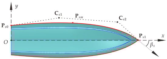 The points Ps0 and Ps1, when projected onto the horizontal plane as (0,Bt,0) and (L,0,0), are used to define the Bézier curve endpoints. For this purpose, the coordinates of the control points Cs1 and Cs2 should be determined, and the curve Ss(u) must satisfy the following requirements: passing through the widest point Psm and having a tangential angle βs with the x-axis at point Ps1. By establishing a system of linear equations based on these conditions, the control points for the horizontal projection of the sheer curve can be obtained by solving the following equations: