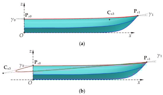 According to Figure 14a, the lateral view curve of the chine could be either a straight line or a slightly curved line. By the way, such a curve can be represented via a quadratic Bézier curve, as presented in Equation (33). The coordinates of the control point Cs3 are to be determined. According to the properties of the tangents at the endpoints of a quadratic B-spline curve, if the angular direction of the tangents at both ends of the curve is employed as a constraint, Cs3 can be obtained as the intersection point of the two tangents. However, improper values of the tangential angles γ0 and γ1 may result in the tangents intersecting at an unreasonable position, as illustrated in Figure 14b.