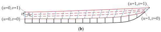 The outer chine curve and sheer curve should be discretely sampled as the starting points for each station curve of the upper surface. The B-spline surface essentially represents an interpolation function defined on a uv grid of quadrilaterals. The discretization approach determines the distribution of uv grid lines in the upper hull surface. Figure 16a illustrates the distribution of uv grid lines formed using the cross-sectional method, where distortions and C1 discontinuities are present at the bow. Within the range [0, 1], n parameter values of ui are uniformly sampled, and then these are respectively substituted into the 3D curve expressions in Equations (30) and (36) for the outer chine curve and the sheer curve. The resulting discrete points Qsi and Qri serve as the endpoints for the station curves, forming the trend of the uv grid, as illustrated in Figure 16b. The obtained uv grid exhibits a reasonable distribution in the bow region.