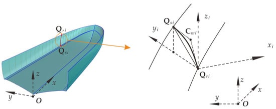 As shown in Figure 17, in most cases, when the points Qsi and Qri are not located within the same cross-section, a local coordinate system Qri-xiyizi is established, with point Qri as the origin. The orientation of the local coordinate system is specified as follows: the corresponding Z-axis is aligned with the hull coordinate system, the Y-axis is pointed towards the horizontal projection point of Qsi, and the X-axis is determined by the right-hand rule. The relationship between the coordinates of point P in the hull coordinate system and its coordinates P’ in the local coordinate system Qri-xiyizi can be stated as follows: