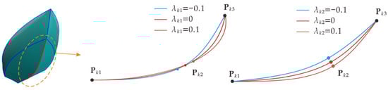 The influence of changing the shape coefficients λk1 and λk2 on the bow curve can be observed in Figure 18. λk1 determines the relative position of point Pk2 in the direction parallel to the chord line, mainly affecting the distribution of the convex positions of the curve. When the value of λk1 increases, the convex position moves forward, and when the value decreases, the convex position moves backward. On the other hand, λk1 determines the perpendicular distance between point Pk2 and the chord line, influencing the overall curvature of the curve. The larger the value of λk1, the greater the overall bending degree of the curve will be. When the value of λk2 is −1, the curve degenerates into a straight line.