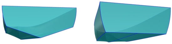 The transverse curvature of the planing surface is determined by the shape coefficients (ks,i and km,i) and the angles (γci and γki). By solving Equation (22), the local coordinate values of the control points are evaluated. By introducing these values to Equation (21), the global coordinate values of C1,i and C2,i are obtained. It can be proven that when the curved shape is either concave or convex, the value of ks,i and km,i can be set equal to 0, resulting in an equivalent quadratic B-spline curve.