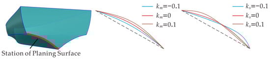 The relative shape of the station curves is mainly influenced by γk(x), γc (x), ks(x), and km(x), in addition to θ(x). To meet the design requirements for the lateral bending shape of the planing surface, constant values or simple functions can be utilized for construction. By using constant values, a planing surface with a constant cross-sectional shape can be achieved. Alternatively, the use of straight lines or other simple functions usually results in a gradual change in the planing surface.