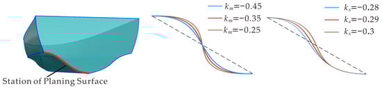 The transverse shape of the planing surface is primarily influenced by γc, γk, ks, and km. When γc and γk take a value of 0, the corresponding cross-sectional shape represents a flat-bottomed planing surface, as presented in Figure 19. When both γc and γk are positive, the planing surface becomes a concave curve, as illustrated in Figure 20. In this case, ks affects the overall curvature, whereas km affects the symmetry of the curve. The same principles apply to the convex surface. When γc and γk have opposite signs, the station curve forms a waveform curve, as illustrated in Figure 21. The effects of ks and km on the curve can be observed in this figure. As can be seen, km influences the overall curvature of the curve, while ks primarily affects the symmetry of the curve. Therefore, through the shape coefficients, various transverse bending shapes of the planing surface can be designed and modified.
