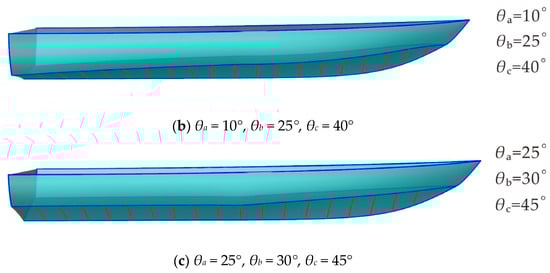 Three sets of planing surface styles generated by the longitudinal functions of deadrise angles are presented in Figure 22. Figure 22a demonstrates a planing hull with a small deadrise angle, whereas Figure 22b exhibits a substantial variation in the deadrise angle with increasing vessel length. According to Figure 22c, the planing hull demonstrates a larger deadrise angle and a sharper bow. These results demonstrate that the modification of the deadrise angle function could effectively design and modify the distribution of deadrise angles for the planing hull.