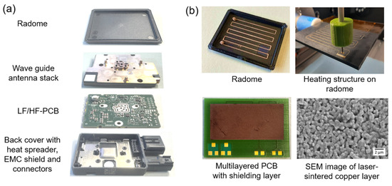 (a) Burst schematic of a modern radar sensor. (b) Additively manufactured component of radar sensor (radome with Cu layer using FDM, heating structure using material deposition, and multilayered PCB with shielding layer).