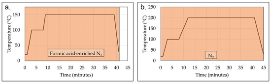 The RSS-160-S reflow oven from UniTemp GmbH, Pfaffenhofen an der Ilm, Germany, was used for the predrying and sintering of the Cu complex ink and Cu paste. The corresponding predrying and sintering profiles for the Cu complex ink and Cu paste are shown in Figure 2. For the Cu complex ink, the peak sintering temperature was 150 °C to facilitate sintering onto low-melting substrates such as PET. Formic acid-enriched N2 was used to prevent surface oxidation in the in situ-formed Cu nanoparticles, since these nanoparticles were < 100 nm, making them highly reactive due to the high surface–volume ratio. For the Cu paste, the peak sintering temperature was 200 °C. Additionally, from the supplier, it was known that the deformation temperature of the radome substrates was <225 °C. Therefore, both materials needed to form conductive sintered Cu metallic traces at a temperature lower than the deformation temperature.