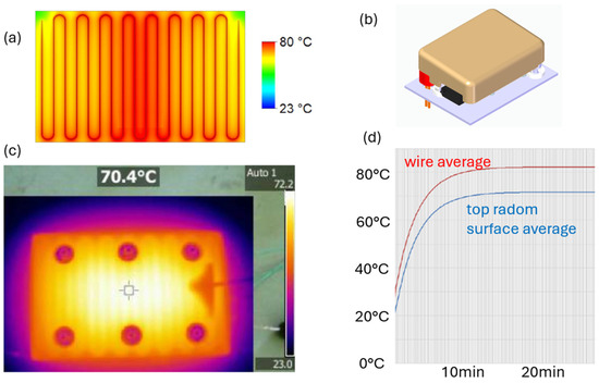 To simplify the electronic driver design, the voltage was considered to be between 8 and 16 V, and the maximum current was restricted to below 3 A. Therefore, a reasonable design to obtain 20 W of heating power using a 10 V driving voltage is a resistance of 5 Ω for the heating coil. Joule heating was simulated by applying the respective 10 V to the end surface of the wire. By adjusting the duty cycle, the heating power could be conveniently varied between 0 W and 20 W. Transient thermal simulation and experimental validation are depicted in Figure 3, showing the heating from room temperature until steady-state conditions were reached. It was demonstrated that heating from −40 °C to 5 °C could be achieved in 3 min using 4 W input power for a radome heater. Validation measurements and simulations were performed under worst-case conditions, i.e., without activating the heat load of the electronic components. The radome in the simulation was from a different radar sensor and approximately twice as large as the one investigated for the AM technologies. Therefore, for heating the smaller radome, 2–3 W of heating power would be sufficient, allowing for an even larger resistance of 30 Ω for the heating coil.