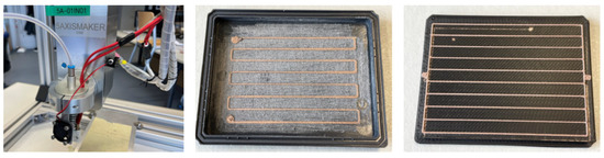 FDM five-axis prototype equipment (5axismaker) on the left side, a printed prototype of a meander heating structure in the center, and a parallel heating structure on the right side. The parallel structure was realized because the specific resistance of the conducting FDM filaments was low. A sufficiently small resistance, able to dissipate sufficient power using a 10 V power supply, is not feasible using a single meander structure.