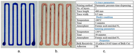 Cu complex ink printed and sintered onto a PET substrate. (a) Cu complex ink printed onto a PET substrate. (b) Cu complex ink sintered onto a PET substrate. (c) Printing and processing parameters with Cu trace properties.