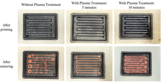 Following the successful realization of conductive copper traces on a PET substrate at a low sintering temperature of 130 °C, the copper complex ink was then printed onto a thicker radome substrate (1 mm). It was observed that the sinterability of the copper complex ink on the radome substrate differed from PET. The significantly greater thickness of the PBT-GF substrate (1 mm vs. 125 µm) increased its thermal mass. This resulted in a longer time for the thicker PBT-GF substrate to heat up and reach a stable temperature during the sintering process. Consequently, the sintering temperature was raised to 150 °C for the radome substrate to achieve a comparable sinterability of the copper complex ink as when using PET. Another challenge encountered was the irregular wetting of the copper complex ink on the radome substrate, as depicted in Figure 6 (left), leading to a discontinuous sintered structure with rapid bubbling (degassing) during sintering. The uneven ink distribution caused gaps or voids in the sintered copper film, compromising its electrical conductivity. To address this issue, an argon–oxygen plasma treatment was performed on the radome substrate for 5 min to enhance the ink’s wettability. The plasma treatment effectively removes contaminants from the radome substrate that impede ink wetting. Additionally, the plasma interacts with the radome substrate’s surface, introducing polar functional groups (such as hydroxyl or carbonyl groups) to elevate the substrate’s surface energy, rendering it more hydrophilic [25,26]. This facilitated the improved spreading and adhesion of the copper ink, resulting in a more uniform and continuous film, as shown in Figure 6 (middle). However, extending the plasma treatment duration to 10 min resulted in the overspreading of the ink, creating unintended connections and short circuits in the sintered structure, as illustrated in Figure 6 (right). The prolonged plasma treatment significantly increased the radome substrate’s surface energy, leading to the excessive wetting of the copper complex ink.