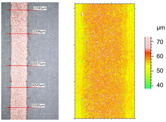 Following the adjustment of wetting through plasma treatment, the dimensions of a five-layer printed and sintered copper metallic trace were analyzed using microscopy and profilometry. The results are presented in Figure 7. A width of 580 µm, with notably smooth edges, and a height of approximately 5–6 µm were measured, which aligns with the dimensional requirements for our heating structure.