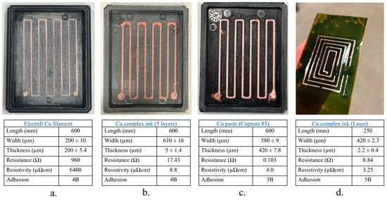 The meander structure depicted in Figure 4, as anticipated, exhibited an excessively high resistance experimentally; specifically, a resistance of 960 Ω was measured. This outcome aligned with expectations based on the datasheet’s specified specific resistance of 6000 µΩcm. Furthermore, it is worth noting that the filament was extruded at a low temperature of 60 °C, while increasing this temperature might further reduce the resistance. The experimentally calculated bulk resistivity of the printed trace was 6400 µΩcm, which is over 3500 times that of bulk copper and consistent with the datasheet. Consequently, the filament was also unsuitable for the heating structure, despite its respectable adhesion rating of 4B.