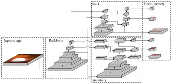 YOLOv9, a new version of the YOLO object detection model, was introduced in February 2024. It uses programmable gradient information (PGI) and a generalized efficient layer aggregation network (GELAN) to reduce information loss and improve efficiency. YOLO is a single-stage detector that analyzes an image once. It has a backbone, neck, and head, as illustrated in Figure 2. The backbone collects features, the neck combines features, and the head detects objects. YOLOv9 also has an auxiliary section that helps with training by providing additional information. This auxiliary can be removed during inference to speed up the model without affecting accuracy [45].