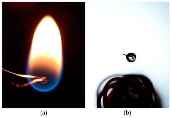 The experiment was carried out under normal gravity, at atmospheric pressure, and at room temperature. The droplet combustion test chamber was a rectangular chamber that was isolated from the influence of ambient airflow during the test. The fuel undergoing the droplet combustion test was placed on a temperature-measuring sensor in the form of a junction thermocouple, which also functioned as a droplet buffer. The thermocouple used was a type R thermocouple (Pt−Pt/Rh wire) with a diameter of 0.1 mm. The combustion process, starting with heating the droplets using a heater coil until the flame went out, was recorded using a Nikon D5300 camera with an AF-S Mikro-Nikkor 40 mm f/2.8D macro lens. The video recording had a shooting rate of 60 fps. The droplet temperature during the droplet heating and combustion process was measured using a type R thermocouple (200 µm diameter of 13%Pt-Rh wire, The Nilaco Corp., Tokyo, Japan) connected to an Advantech USB-4718 data logger, which was linked to a computer for data acquisition. The data logger and computer recorded droplet temperature data during the combustion process with a sampling rate of 10 Hz (100 ms) and a maximum error of ±2.5 °C in comma-separated value (csv) format files. The technique used to capture video footage of the droplet combustion test employed the self-illuminated direct imaging method, similar to several prior studies [22,37].