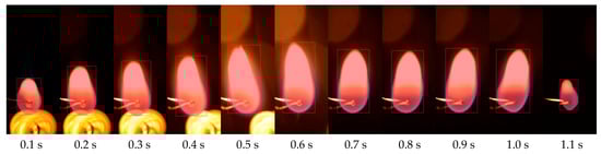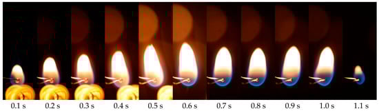 The model’s dependence on supervised learning may pose difficulties in recognizing unfamiliar objects or regions. Figure 8 demonstrates that YOLOv9 failed to precisely segment certain flame areas within 0.1 s of the combustion process; therefore, there are still some shortcomings in YOLOv9 that can be improved in future versions [59]. There is a noticeable distinction between the initial flames and those observed after several combustion processes, where the blue color is less dominant in comparison to yellow and other colors.