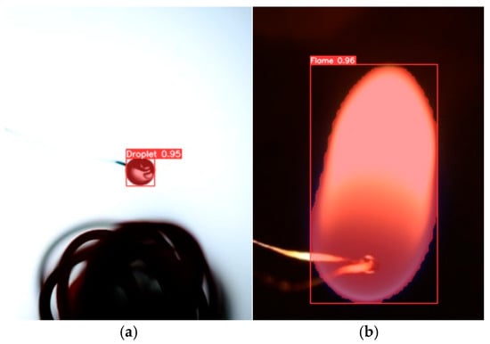 Changes over time in the diameter of the droplets and the visualization of the flame were analyzed using an object detection and segmentation technique that utilized the YOLOv9 deep learning algorithm. To track the changes in droplet diameter, the segmentation area of the droplet was utilized to compute the equivalent area. The equivalent diameter was then determined by applying the circular area formula described in Equation (1).