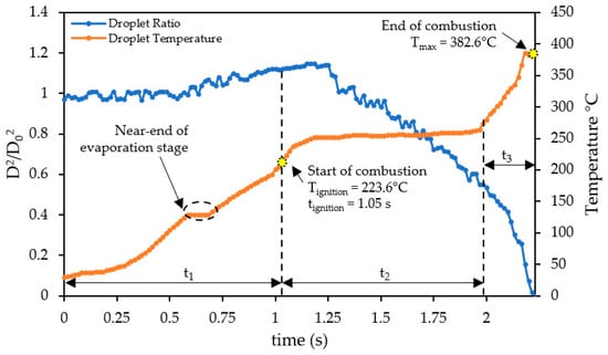 The change in droplet diameter during one individual test is shown during the ignition delay period until the end of the droplet’s lifespan in Figure 10. The combustion period is segmented into three stages: t1 represents the heating phase, t2 signifies the unsteady combustion phase, and t3 denotes the quasi-steady combustion phase. All fuel droplets gradually increase in size due to the expansion of bubbles, thermal expansion during the heating phase, and movement of bubbles to the surface of the droplet.