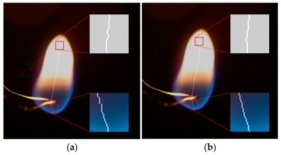 Figure 3 illustrates relatively the same situations for different conditions. Figure 3a shows the camera focusing on the flame, and Figure 3b shows the camera focusing on the droplets. The second situation can be achieved by providing light from the background so that the light and shape of the fire can be ignored. Meanwhile, to determine the shape of a flame (first situation), the flame was isolated from external light interference so that the only source of lighting was the flame.