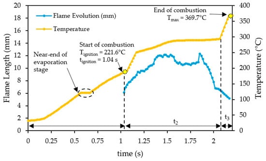 The visualization of the flame was employed for the qualitative examination of methyl laurate combustion. Figure 4 illustrates the progression of flame height during the combustion of droplets, wherein the fuel is subjected to a high-temperature environment, leading to its evaporation and subsequent diffusion with the surrounding air to create a gaseous phase. Ignition occurs when the vapor–air mixture reaches a composition within the flammable limit range, resulting in the formation of a flame envelope and the generation of combustion products [53].