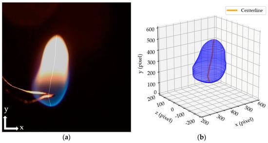 The flame length was derived through precise centerline extraction and processing based on the machine vision algorithm. Initially, the centerline was computed by identifying the middle pixel positions along the flame contour at each vertical axis level within the segmented flame image. This technique ensures that the centerline accurately represents the flame’s structural symmetry. Figure 11 shows the extracted centerline data, which were then processed using the Savitzky–Golay filter to reduce noise and smooth their trajectory, providing a robust representation of the flame’s progression [63]. Subsequently, the centerline was reoriented to align with the flame’s horizontal axis, thereby transforming the conventional measured flame height into flame length. Flame height is the vertical distance from the flame base to its tip, primarily influenced by buoyancy, and it is visible in stationary flames. Flame length, in contrast, measures the entire flame axis, including its curvature, capturing both visible and reaction zones. It is commonly used for flames experiencing disturbances due to turbulence. This approach facilitates a more accurate analysis of flame evolution, ensuring compatibility with the horizontal plane typically used in combustion studies.