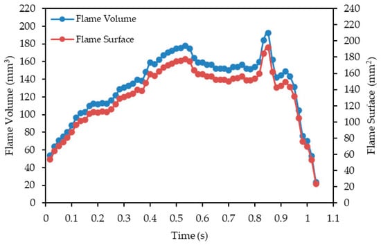 The resulting data are then analyzed over time to evaluate the evolution of flame volume and surface area during combustion, as shown in Figure 14. This methodology ensures that temporal fluctuations and structural changes in the flame are accurately captured.