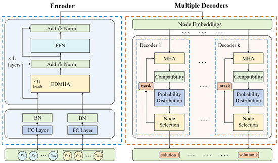 Our model leverages the encoder–decoder architecture, similar to the milestone AM [25]. To fully exploit edge information and better capture the dynamics of state transitions, we design an Edge-Driven Multiple Trajectory Attention Model (E-MTAM). Specifically, our E-MTAM incorporates three key modifications: (1) we embed edge information into the multi-head attention layer to effectively learn a representation of the underlying graph topology, which we refer to as edge-driven multi-head attention (EDMHA); (2) we integrate dynamic visitation information into the graph embeddings to be input into the decoder, enabling the decoder to perceive real-time changes in the visited graph; (3) we adopt a multi-decoder structure and introduce a regularization to encourage the decoders to output diverse trajectories, thereby learning distinct routing strategies.