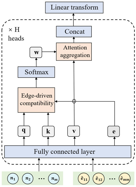 where and are trainable query, key, and value matrices, respectively, for each head h. Subsequently, we incorporate edge information to enhance the conventional compatibility and compute the weight values through a softmax layer: