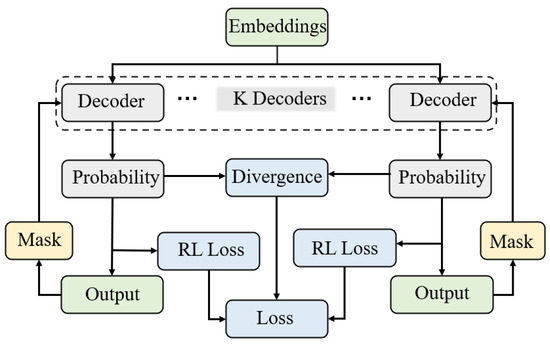 At the end of each episode, the K decoders in our E-MTAM generate K distinct solution trajectories, each of which consists of the action sequences produced by a decoder at each time step. To encourage diversity among the decoders and promote the generation of more varied solution trajectories, we incorporate the following regularizer into the training process and propose a to diversify the probability distributions output by each pair of decoders: