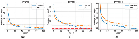 To facilitate a more comprehensive comparison, we present the training curves of E-MTAM and AM on CVRP20, CVRP50, and CVRP100. As shown in Figure 4, the average tour length of both models steadily decreases during the training process and eventually converges in the later stages, demonstrating the effectiveness of our training framework. Furthermore, E-MTAM exhibits a faster learning speed, although it does not attain a shorter tour length in the early stages (especially on CVRP20 and CVRP50). E-MTAM ultimately delivers superior results across all problems, approaching the best results attained by LKH (indicated by the horizontal dashed line). Notably, as the problem size increases, the advantages of E-MTAM become more pronounced.