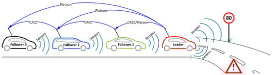 Platoon-based traffic signal optimization has emerged as a promising solution to mitigating delays for heavy vehicles by leveraging advancements in connected vehicle (CV) technology [,]. Recent studies have demonstrated that HCV platooning, where groups of heavy connected vehicles (HCVs) travel in close formation under coordinated control, can significantly improve traffic flow, reduce stops, and enhance fuel efficiency [,]. The concept of HCV platooning is enabled by Cooperative Adaptive Cruise Control (CACC), which allows vehicles within a platoon to communicate and synchronize speed, acceleration, and braking []. Figure 1 illustrates the structure of an HCV platoon, where a leader vehicle determines movement dynamics while following vehicles respond accordingly. However, while platoon-based optimization has been explored for passenger vehicles, existing traffic signal-control frameworks rarely consider the unique operational constraints of heavy vehicles, such as increased braking distances, cargo priority, and intersection clearance requirements [].