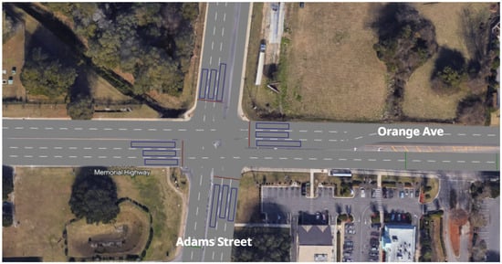 To validate the proposed approach, a case study was conducted at a major high-traffic intersection in Tallahassee, Florida (Orange Ave and Adams Street), a key corridor for logistics operations. Figure 2 presents an overview of the study site, highlighting its relevance for evaluating platoon-based signal optimization in real-world freight-movement scenarios. The VISSIM microscopic traffic-simulation model, calibrated to Florida Department of Transportation (FDOT) guidelines, was used to replicate real-world traffic conditions, incorporating distinct behavioral models for non-CVs, platoon leaders, and platoon followers []. The performance of the developed algorithm was compared against actuated signal control and individual vehicle-based optimization strategies across varying CV penetration levels.