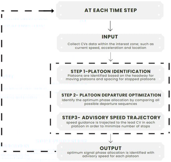 Figure 3 illustrates the logic of the HCV platoon-based adaptive signal-control algorithm, highlighting the various components involved in optimizing signal timings for mixed traffic environments, where HCVs interact with non-CVs and smaller vehicles. The control algorithm operates as a discrete loop, continuously updating itself at each time step based on real-time traffic conditions.