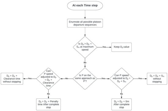 Figure 5 visually represents the departure sequence algorithm’s flowchart, illustrating how the algorithm operates at each time step. The traffic signal enumerates all possible platoon departure sequences for every time step. The algorithm then evaluates each departure sequence to determine the associated average vehicle delay. Ultimately, the departure sequence with the smallest average vehicle delay is selected, ensuring the most efficient progression of platoons through the intersection. The algorithm optimizes signal timings and improves overall traffic flow by continuously adapting to the evolving traffic conditions.
