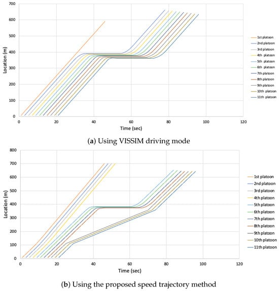 By integrating the Intelligent Driver Model (IDM) with the three adaptive speed scenarios, the proposed advisory speed trajectory algorithm effectively reduces the number of stops, minimizes delays, and enhances intersection efficiency for heavy vehicle platoons. Figure 6 visually demonstrates the impact of this approach on HCV progression through intersections.
