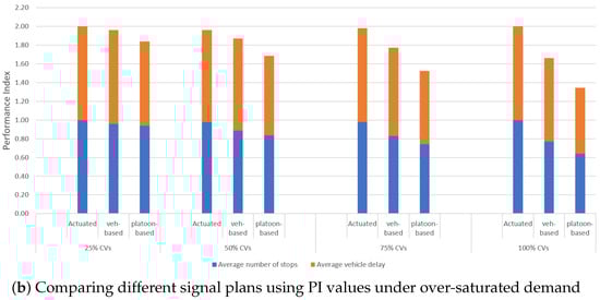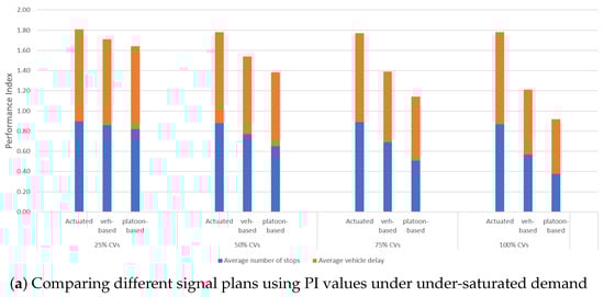 The findings demonstrate that the platoon-based algorithm effectively decreases the frequency of stops in both under-saturated and over-saturated traffic scenarios, as shown in Table 3. Under under-saturated demand conditions, the number of stops decreased by 55% compared to actuated signal control (p < 0.001) and by 40% when compared to the vehicle-based algorithm (p < 0.01). Under over-saturated demand conditions, the reduction in the number of stops was 35% relative to actuated signal control (p < 0.01), while the improvement over the vehicle-based method was 17% (p < 0.05). These reductions highlight the ability of the platoon-based approach to optimize vehicle movements and minimize unnecessary stopping.