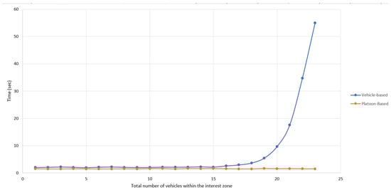 In contrast, the platoon-based algorithm maintains a stable and low computational time, even as the number of vehicles within the interest zone increases. Since the platoon-based approach treats a group of vehicles as a single unit rather than individually optimizing each vehicle’s movement, the total number of computations remains significantly lower. This characteristic makes the platoon-based algorithm highly scalable and suitable for real-time traffic-management applications.