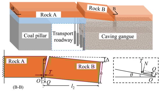 With the advance of the working face, the roof rock breaks after reaching the limit span. The stability of the formed masonry beam structure is mainly controlled by the key rock block B. The force of the hinge point of rock block A and rock block B is shown in Figure 5. The horizontal thrust formed by rock block B on the pre-splitting slit section is T, and the shear force on the slit section is Q.