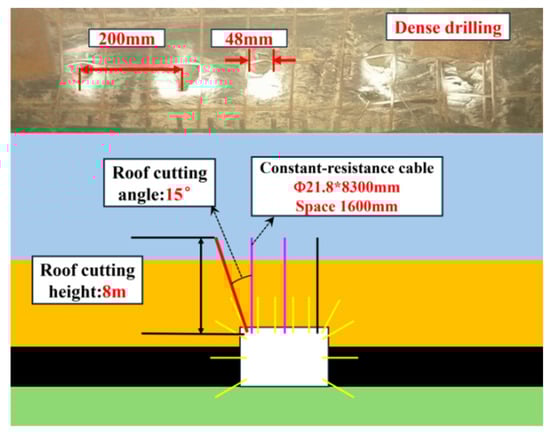 Following comprehensive theoretical analysis and numerical simulation comparison, the key parameters of dense-drilling roof cutting are determined: the roof cutting height is 8 m; the cutting angle is 15°; the diameter of the borehole is 48 mm; the center distance of the borehole is 200 mm. In order to avoid the influence of the equipment at the end of the roadway, the dense drilling construction is 50 m ahead of the working face, and the drilling construction operation is parallel to the working face to ensure that the roadway can be supported in time. The layout scheme of roof-cutting dense drilling is shown in Figure 15.